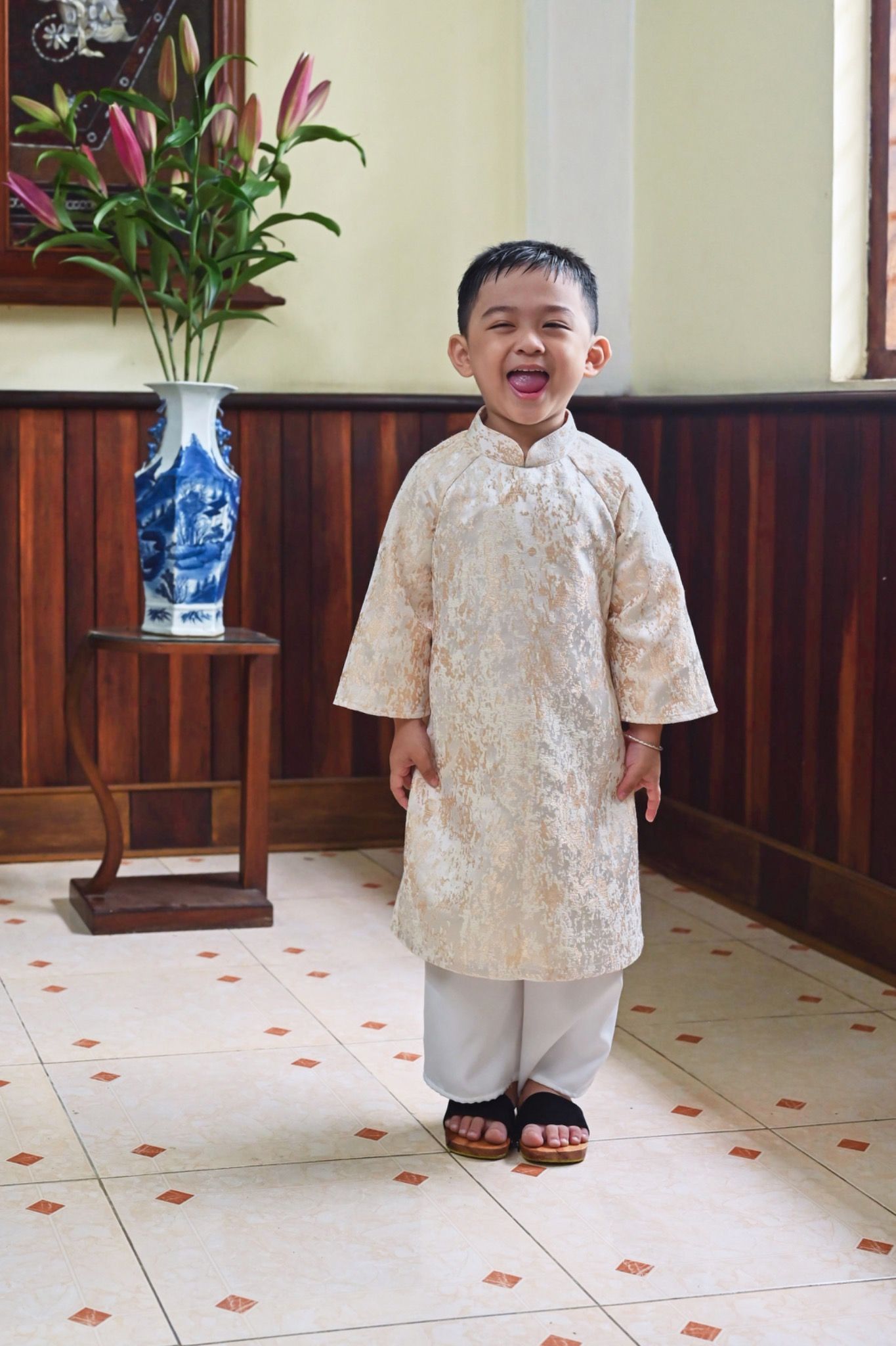 Áo dài Bé Trai Gấm Kem