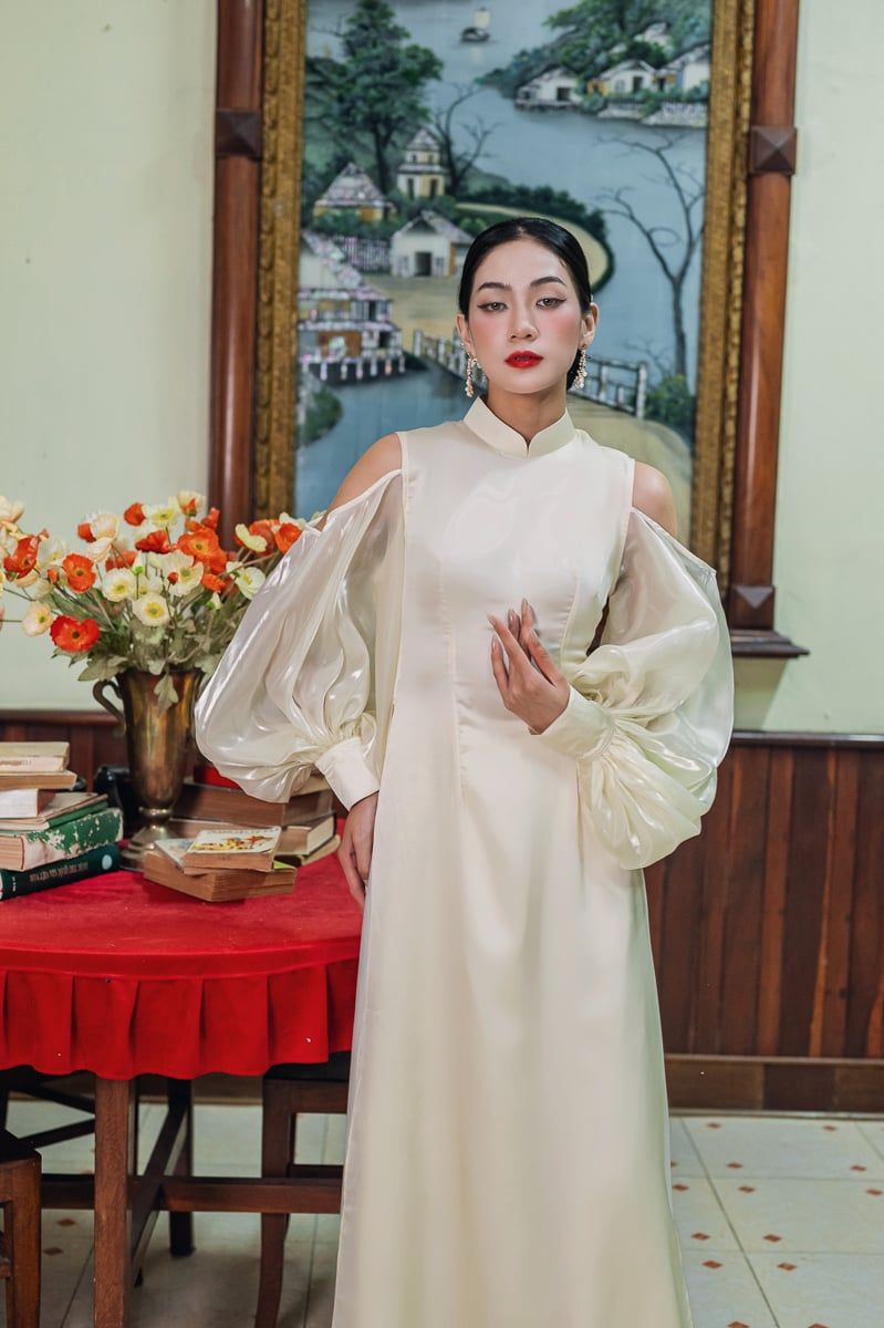 *Thiết kế cách điệu phần tay bồng chất liệu tơ ánh kim.