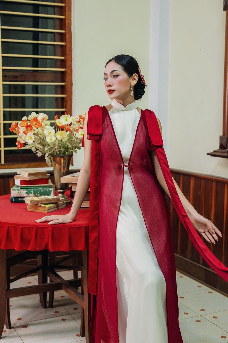 *Thiết kế gồm 1 áo dài yếm & 1 áo choàng nơ khoác ngoài từ chất liệu Tơ Sao Băng.