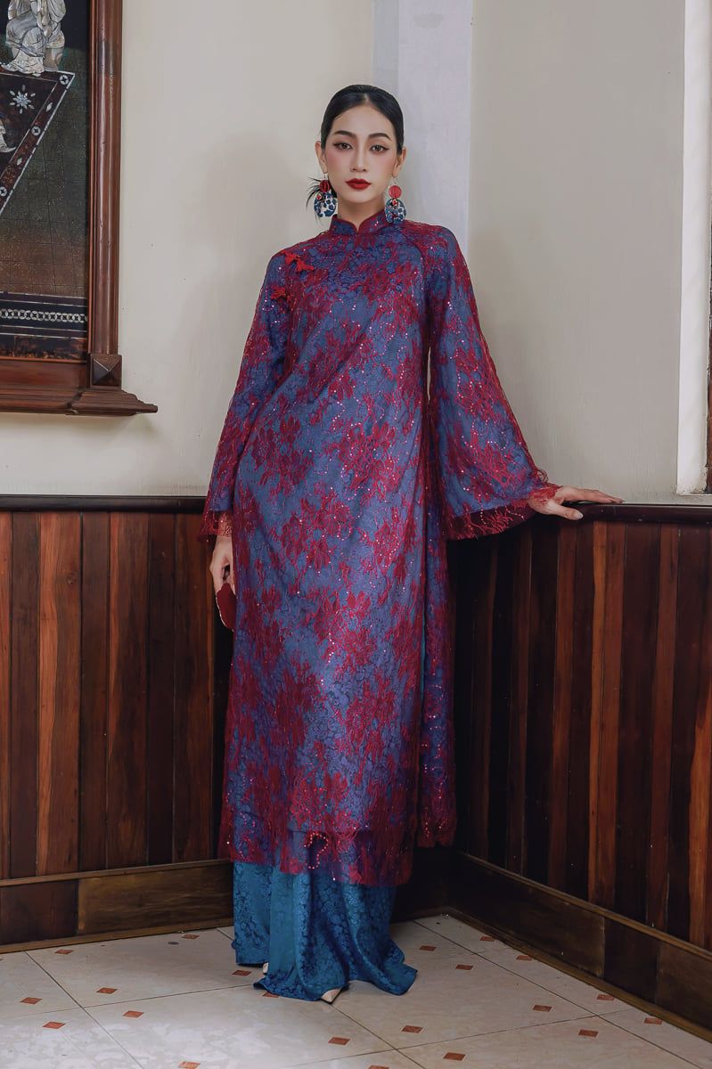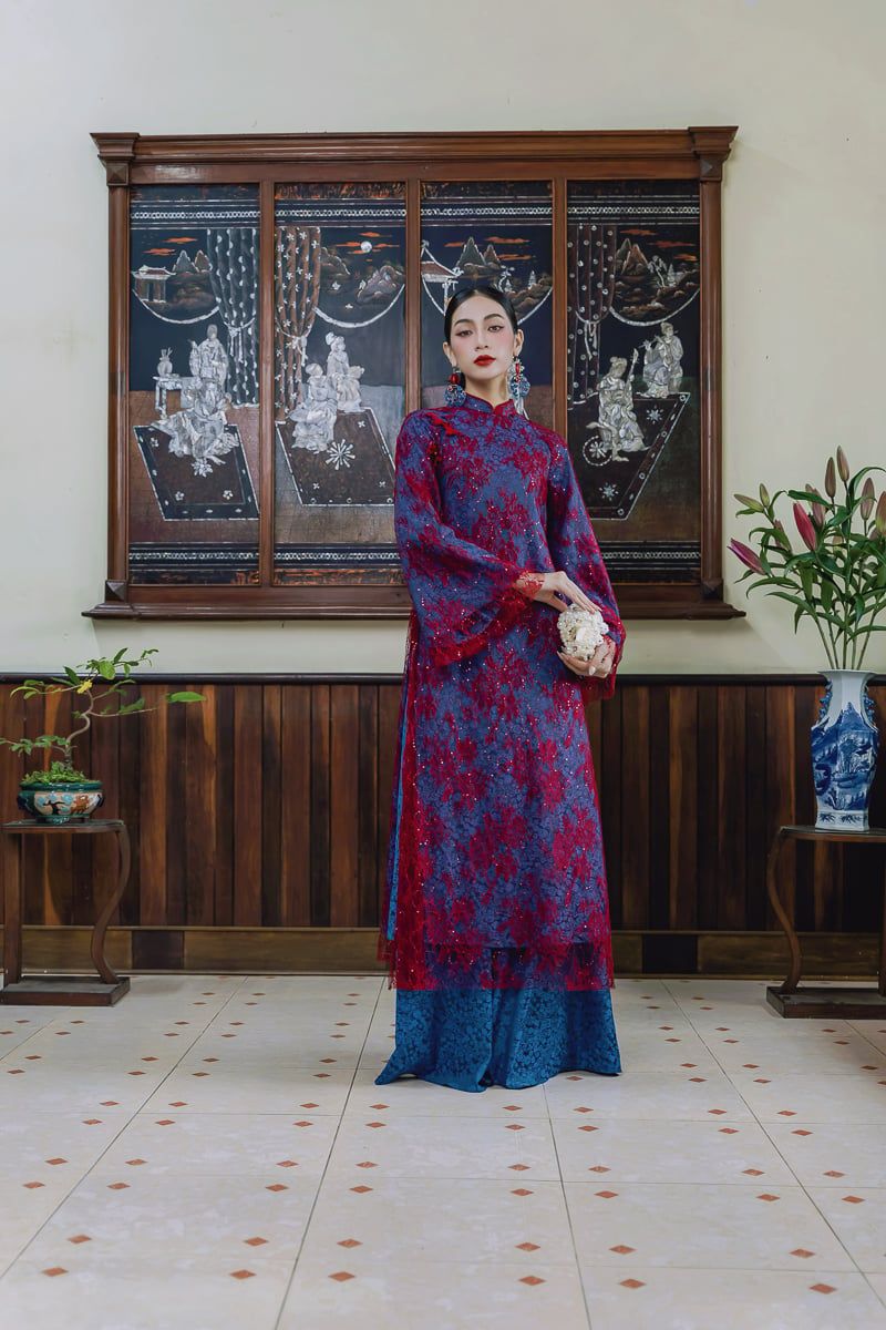 - Màu sắc: Xanh navy phối ren tím