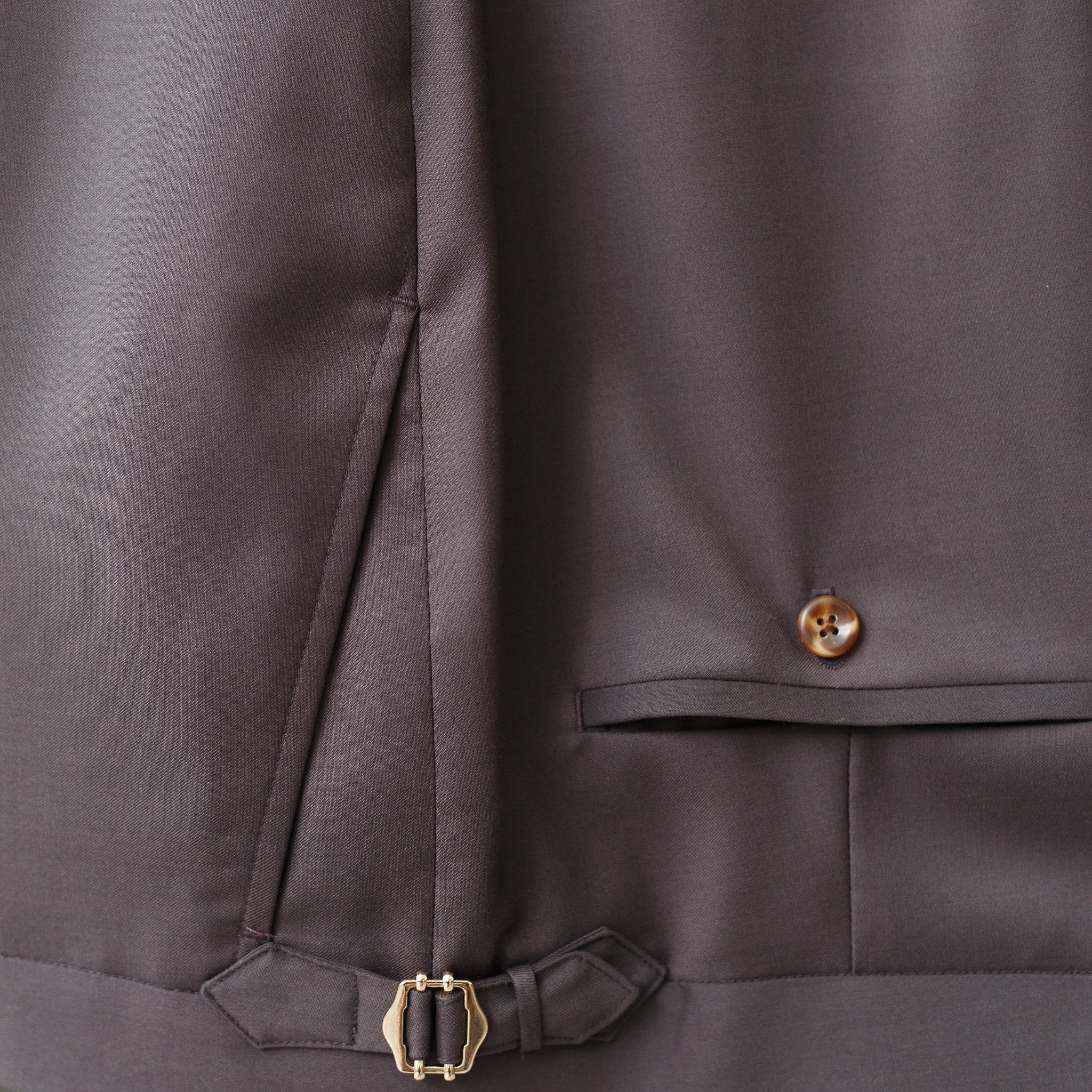 Chiếc quần tây vải len màu nâu sáng đặc biệt. Quần sử dụng tăng đơ dễ dàng cho các quý anh điều chỉnh độ rộng cho phù hợp với số đo khác với phong cách truyền thống sử dụng thắt lưng.